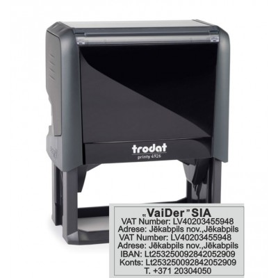 Trodat Printy 4926 ir populārs un praktisks pašiespiešanas zīmogs, kas piemērots ikdienas lietošanai birojā vai mājās. Tā nospieduma izmērs ir 74 x 37 mm, kas ir pietiekami liels, lai ietilptu līdz pat 8 teksta rindām. Šis zīmogs ir viegli lietojams un nodrošina tīru un precīzu nospiedumu katru reizi. Trodat Printy 4926 ir izgatavots no augstas kvalitātes materiāliem, kas nodrošina tā ilgmūžību. Zīmogs ir pieejams dažādās krāsās, tāpēc varat izvēlēties sev piemērotāko variantu.