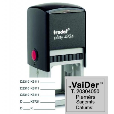 Trodat Printy 4924 ir populārs un praktisks pašiespiešanas zīmogs, kas piemērots ikdienas lietošanai birojā vai mājās. Tā nospieduma izmērs ir 40 x 40 mm, kas ir pietiekami liels, lai ietilptu līdz pat 5 teksta rindām. Šis zīmogs ir viegli lietojams un nodrošina tīru un precīzu nospiedumu katru reizi. Trodat Printy 4924 ir izgatavots no augstas kvalitātes materiāliem, kas nodrošina tā ilgmūžību. Zīmogs ir pieejams dažādās krāsās, tāpēc varat izvēlēties sev piemērotāko variantu.