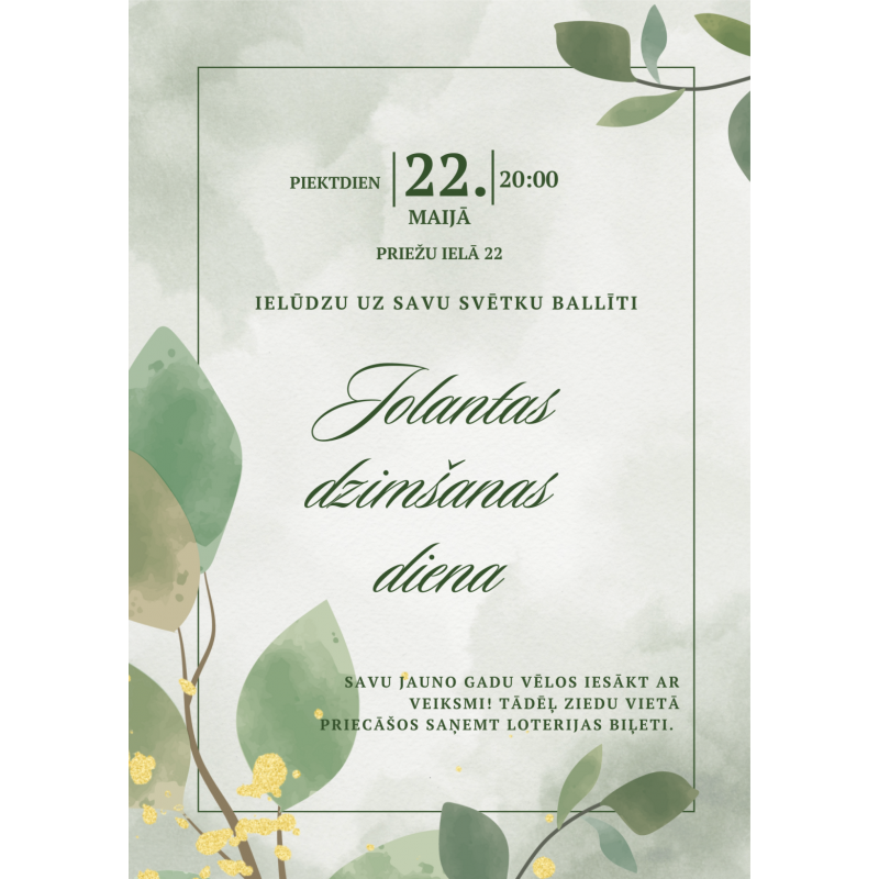 Šis digitāli pielāgojamais ielūgums ir ideāls veids, kā aicināt draugus un ģimeni uz šo īpašo notikumu. Uzaicini uz svētkiem, nosūtot ielūgumu uz e-pastu vai sociālajos tīklos - ērti un viegli!