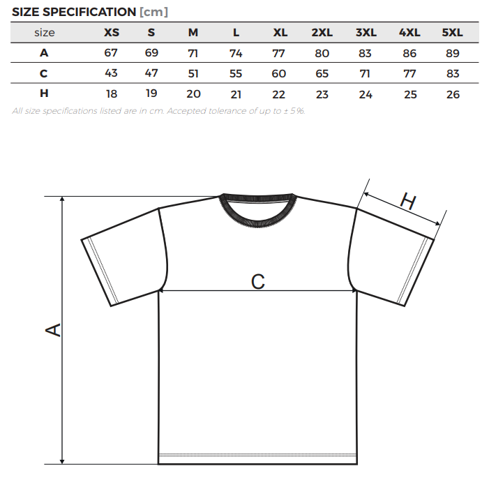 T-krekla (160 g/m²) pieejamie izmēri XS-XXL.